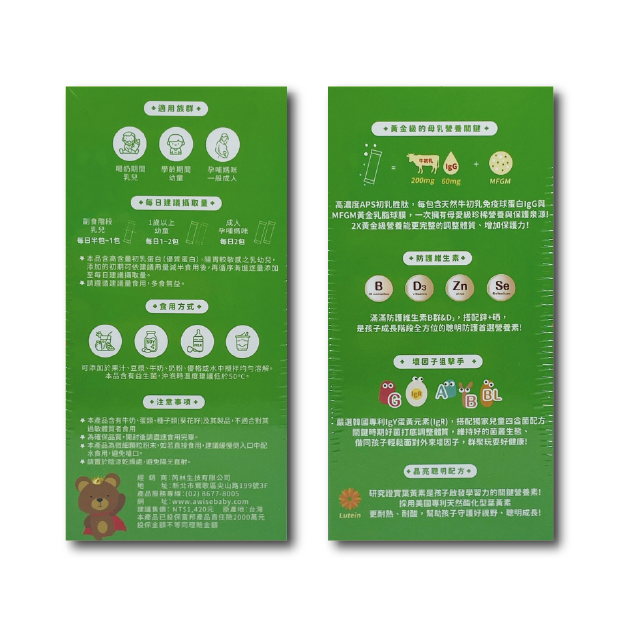 ◆成人/孕哺媽咪 每日2包 本品含初乳蛋白(優質蛋白),腸胃較敏感之乳幼兒,建議添加初期可依建議用量減半食用後,再循序漸進逐量添加至建議添加量。