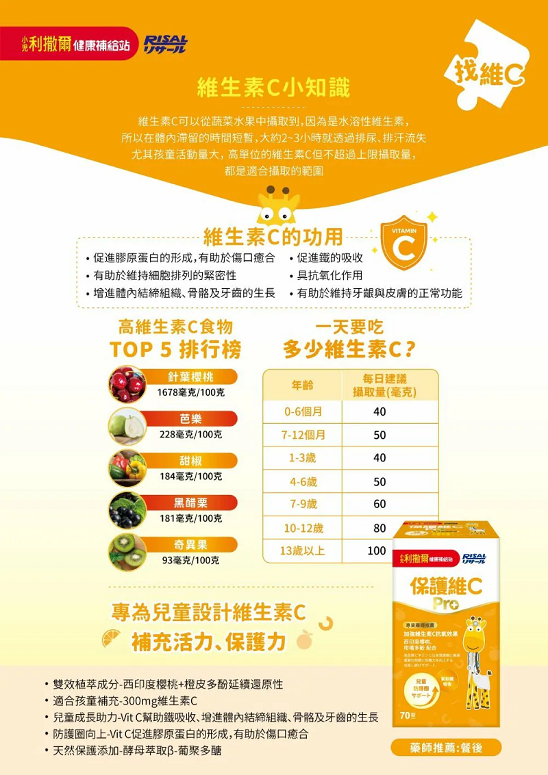✅ 兒童成長助力:VitC幫助鐵吸收、增進體內結締組織、骨骼及牙齒的生長。